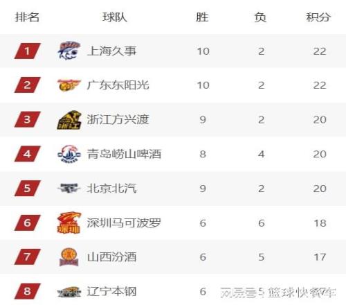 积分榜第6名则属于深圳队,他们这一场比赛客场输给了实力强大的广东队,这一战过后,他们的战绩变成6胜6负,胜率刚好过半,暂时排在积分榜第6名。而山西队则紧随其后,以6胜5负的战绩,排在积分榜第7名。积分榜第八名则属于四冠王辽宁队,他们在上一轮比赛结束四连败,目前的战绩是6胜5负,暂时排在积分榜第8名。而积分榜第9名则是宁波队。第10名则是广州队,他们的战绩是6胜4负。