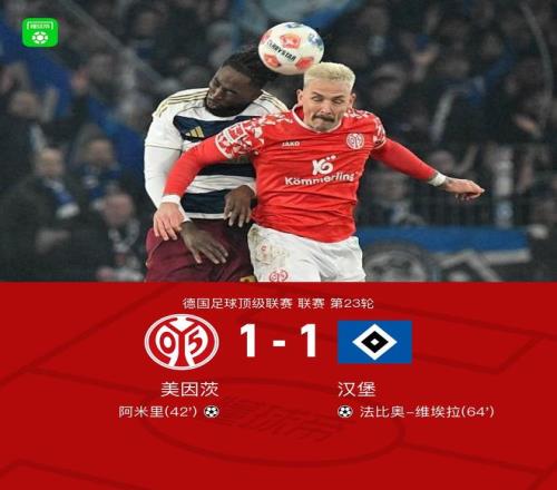 北京时间2月21日德国足球顶级联赛 联赛 第23轮,美因茨主场对阵汉堡。上半场,达科斯塔传中,阿米里凌空扫射破门。下半场,法比奥-维埃拉任意球击中人墙变线入网。全场比赛结束,美因茨1-1汉堡。